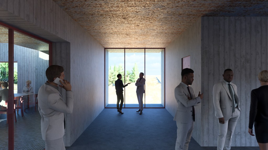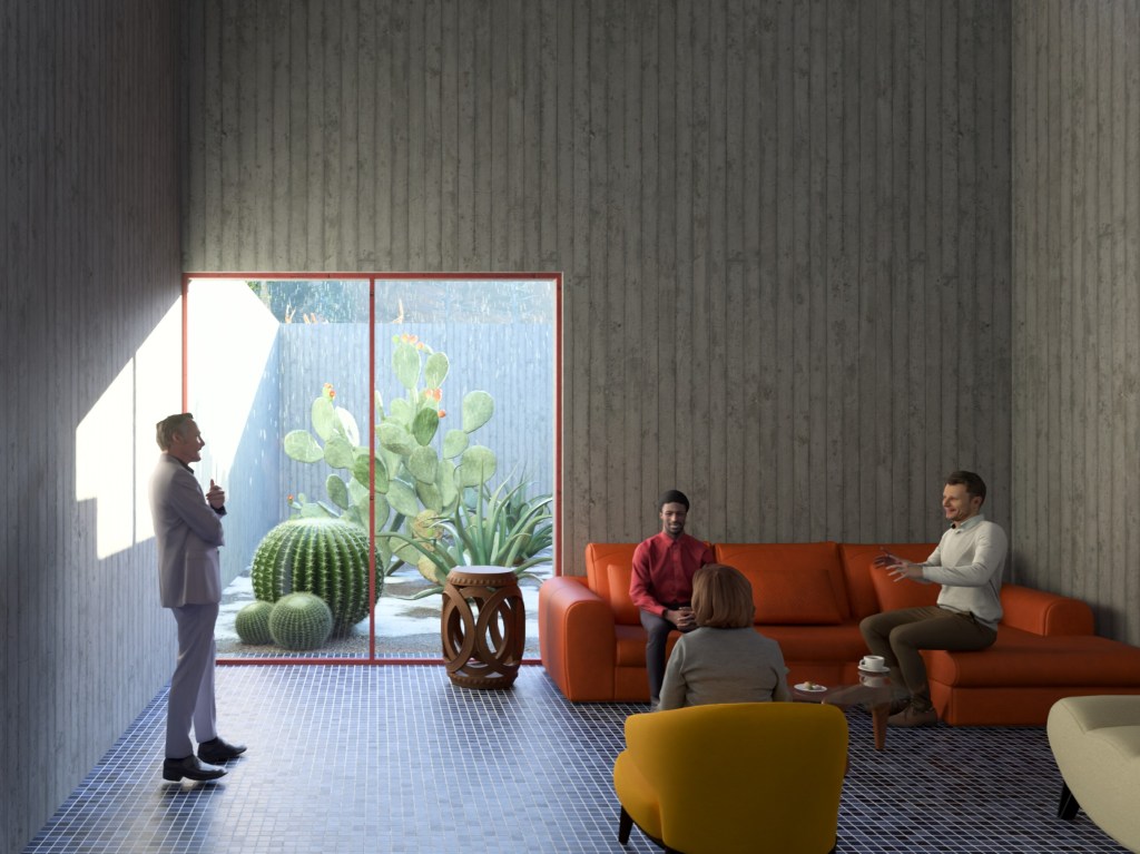 Filling the space between lounges, gardens, terrace and courtyard, the arcade is an open flow space with eccentric corners for more intimate conversations. It is a break-out space for the courtyard.