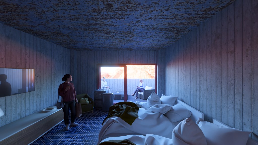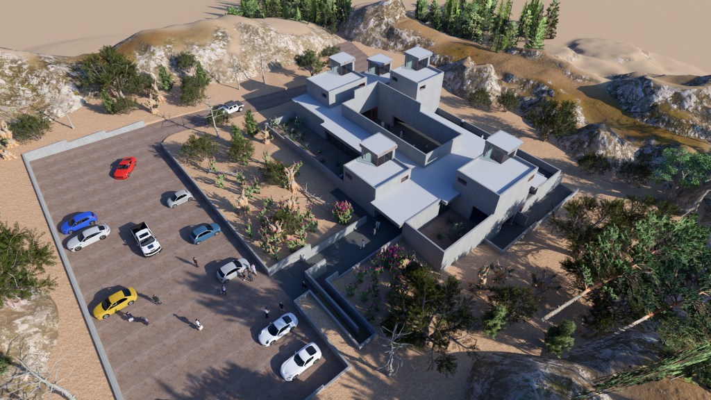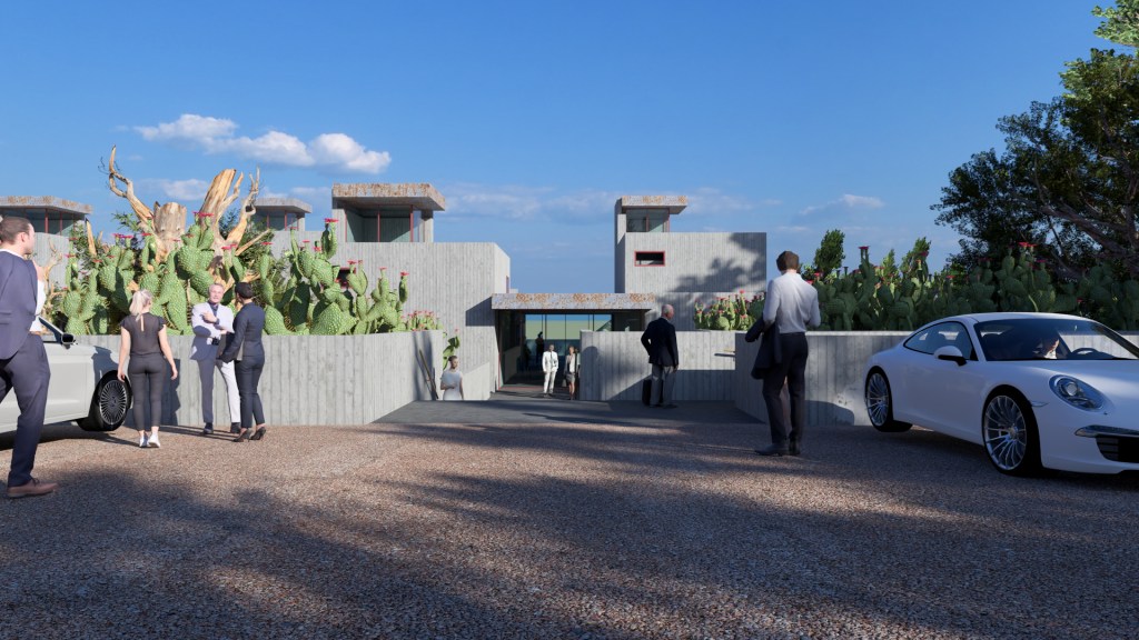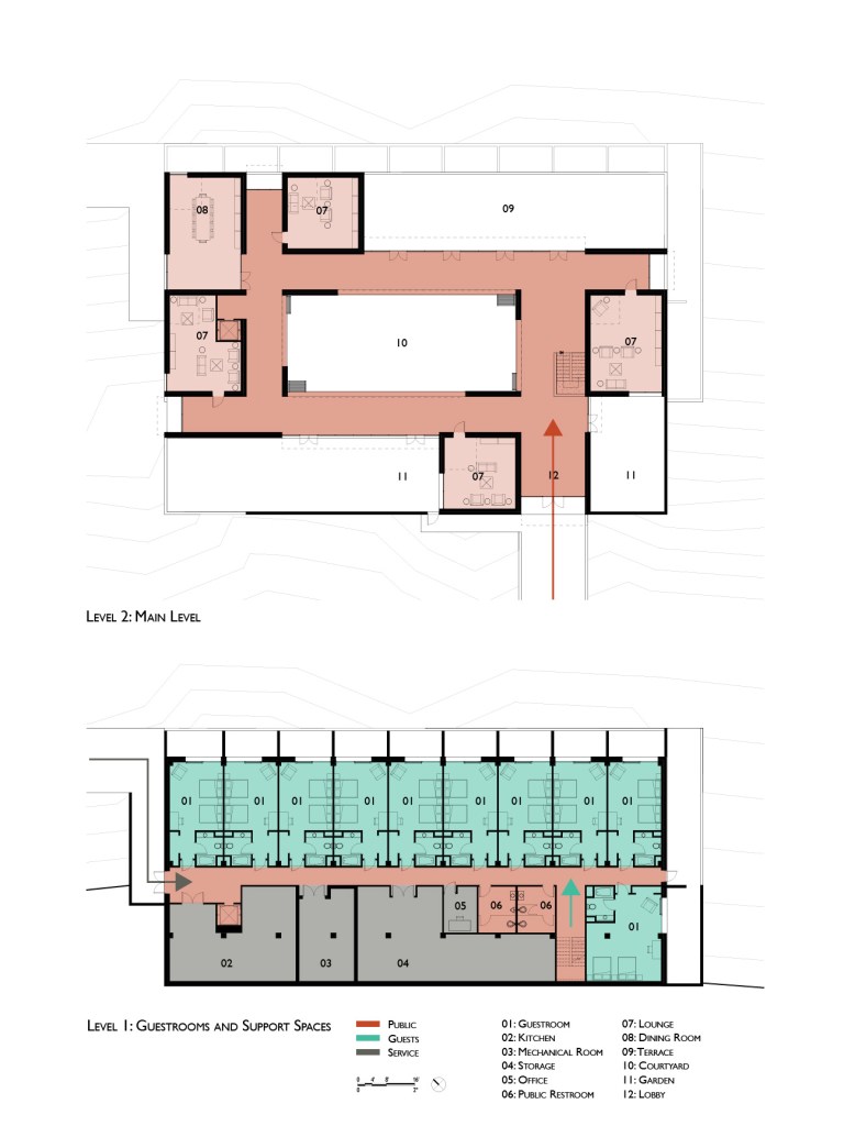Below the main event level, 10 guestrooms lead out onto patios with expansive views of the desert to the northeast. The venue’s functions are supported by a full commercial kitchen and other support spaces. Total GFA: 18000 SF.