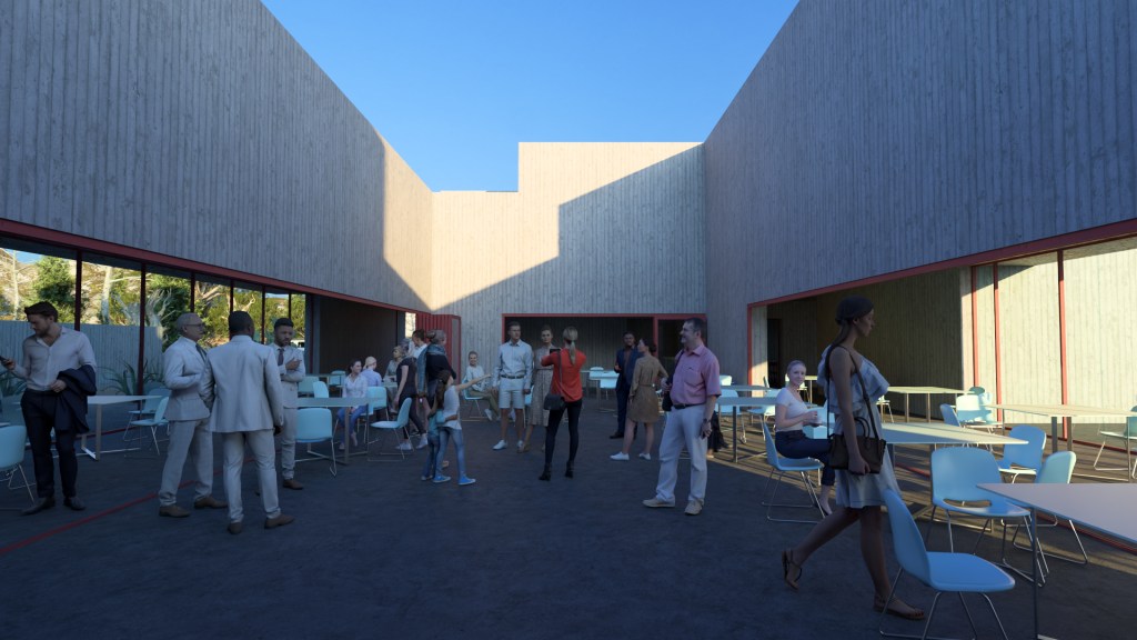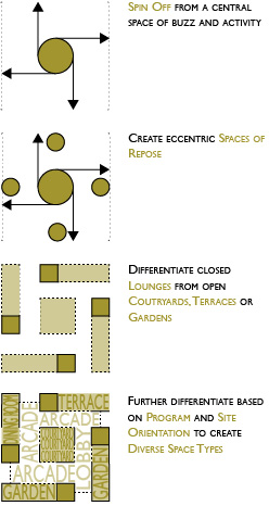 Like its historic precedents, the Hacienda centers around a courtyard, the focal point of gatherings. To support “getting away from the crowd” for more intimate conversations, however, the courtyard is surrounded by eccentric breakout spaces (arcades, terraces and gardens) anchored by tall, enclosed volumes (lounges). The contrast between the intimate lounges and the expansive “flow space” provided by the courtyard and arcade defines the project’s design.