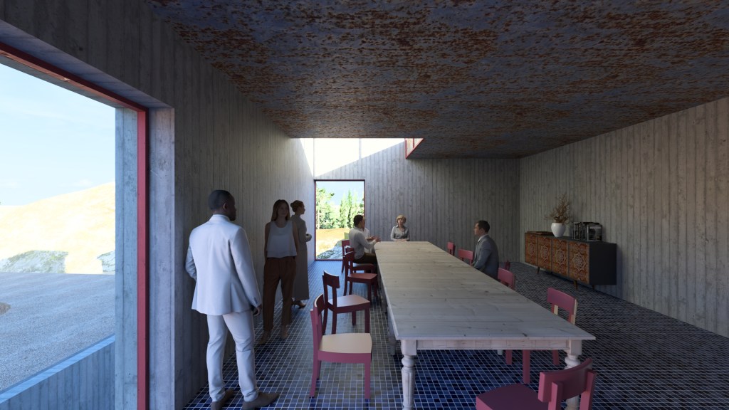 On the eastern corner, the terrace opens up the Hacienda to an expansive panorama of New Mexico high desert, providing spectacular views and a backdrop for weddings and other events. The arcade can serve as additional seating space and the terrace can be opened up to become fully part of the flow space around the courtyard.