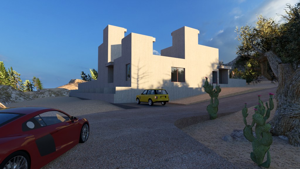 Guests enter from the parking lot on the upslope (southwest) side. The Hacienda appears as a low-profile collection of volumes, opening selectively to allow views out or visitors in.
