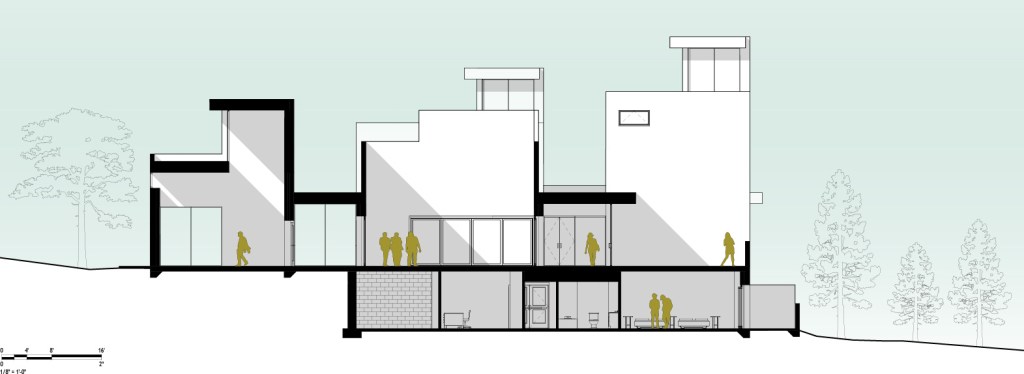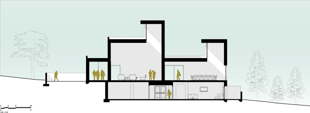 Section through the west garden, arcade, northwest lounge and dining room on Level 2, and the kitchen and guestrooms on Level 1. Lounges vary in height to give a different feel to each space.