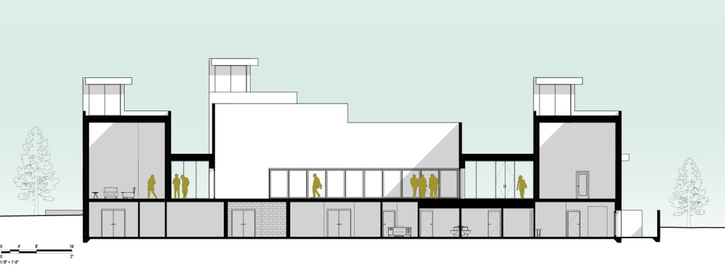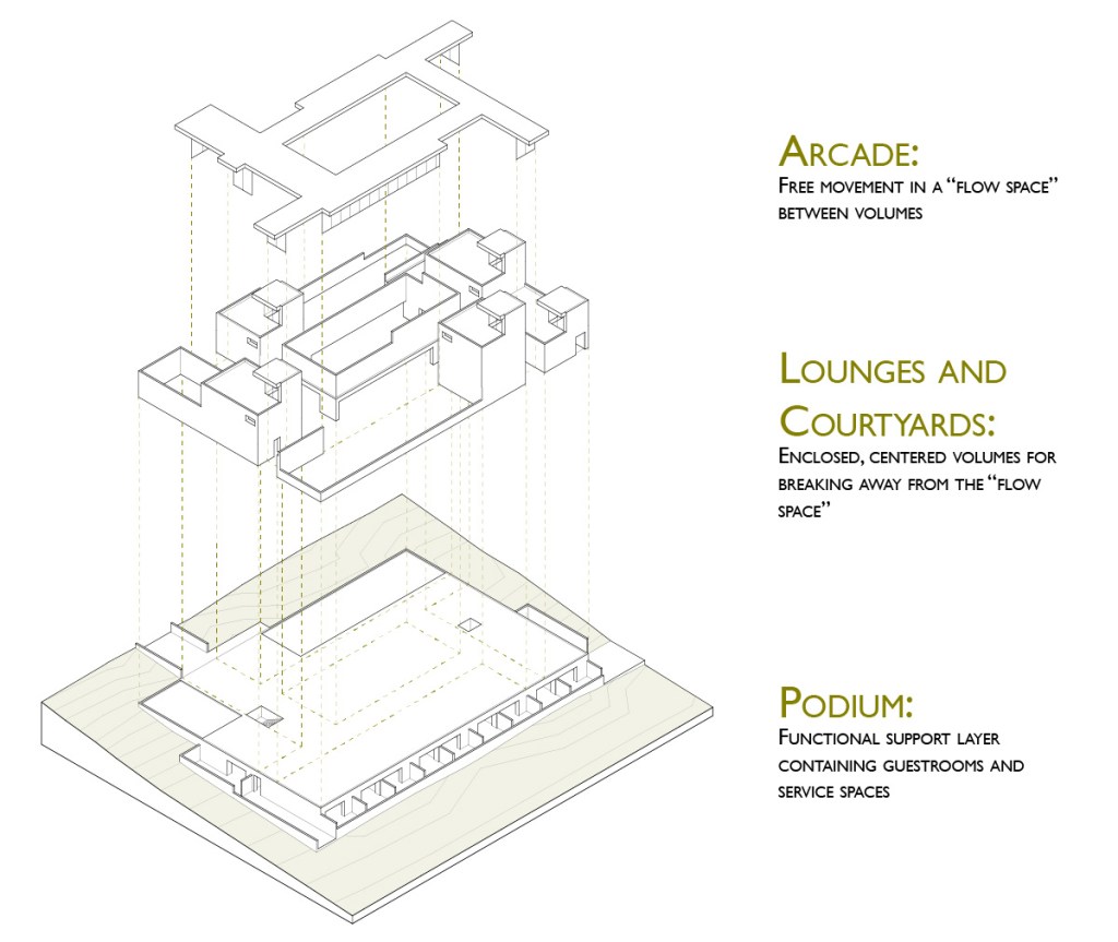 Section through the southwest lounge, arcade, courtyard and terrace, with support spaces and guestrooms below.