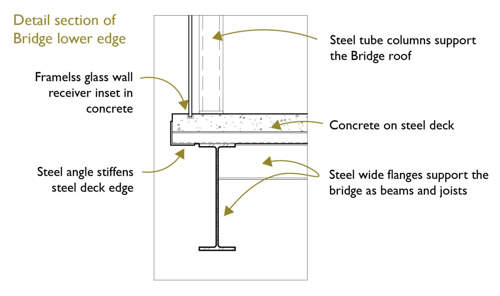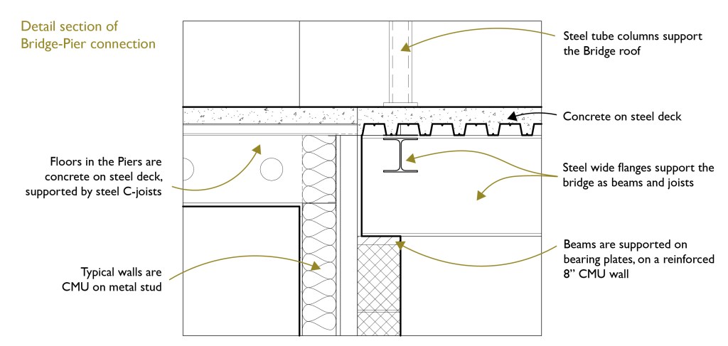 The bridge connects two pies; the lawn passes underneath: