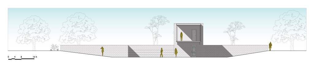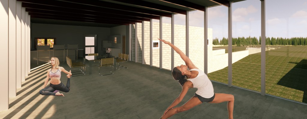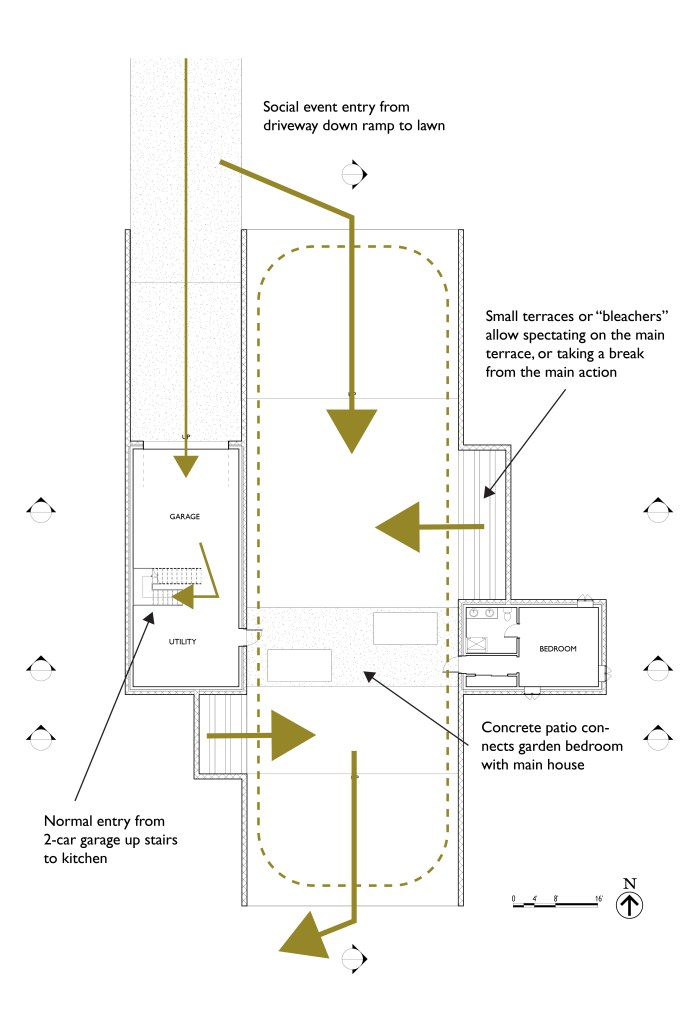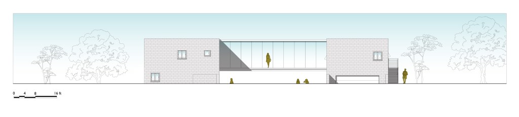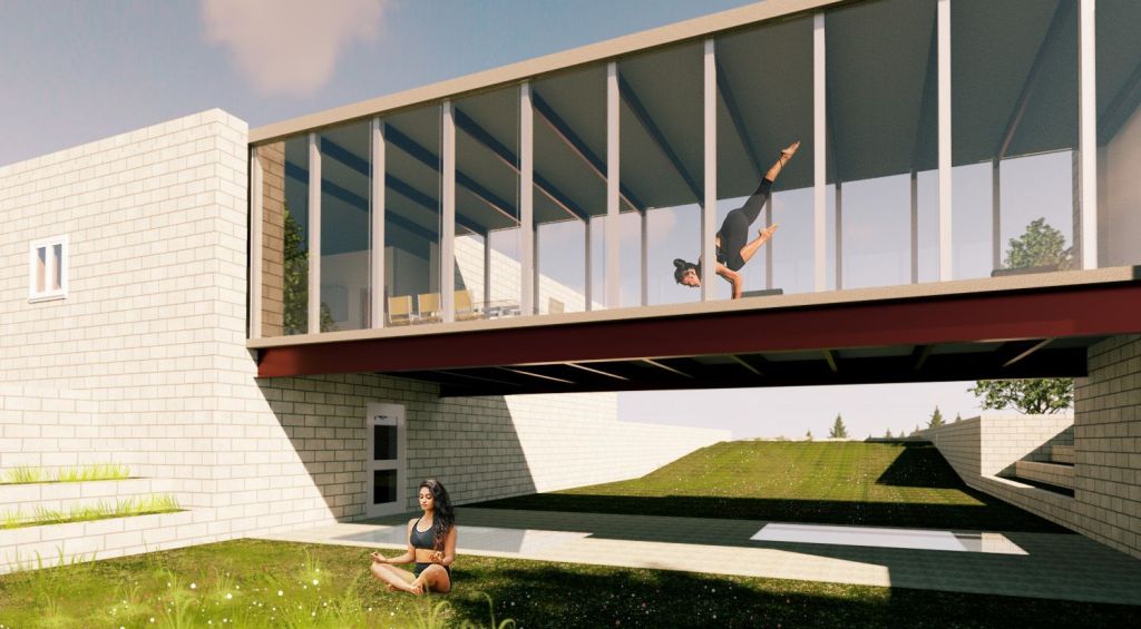 This concept for a 3000-square foot leisure-focused modern residence was an opportunity to practice modeling and rendering in Revit. The house centers on an open bridge structure containing an airy living/dining/exercise space soaring over a sunken lawn.